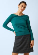 Deze top wil je iedere dag wel dragen! Heerlijk om te dragen dankzij de luxe, soepele en stretchy, fijngebreide, tealkleurige katoenmix met zijde. De combinatiemogelijkheden zijn eindeloos! * Boothals * Lange mouwen * Stretchy ribboord * Lang genoeg om op een normale heupbroek te dragen