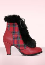 “Bold red booties, where cozy faux fur meets timeless tartan.” Deze warm gevoerde laarsjes met hak zijn uitgevoerd in rood imitatieleder met een bies van zwart nep bont en een stoffen gedeelte voorzien van een classy tartan print in rood, blauw en groen. * Vetersluiting * Ritssluiting * Hoog hakje * Comfy binnenzool * Anti-slip zool
