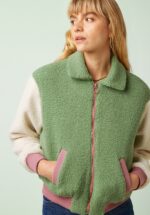 “Pastel dreams, cozy scenes.” Dit te leuke bomberjasje is een echte eyecatcher! Ze is uitgevoerd in een zachte, gerecyclede teddy stof met een lichte stretch, waardoor ze heerlijk comfortabel draagt. De mintgroene body met crèmekleurige mouwen krijgt een extra vrolijke twist door de roze biezen en rits. Kort, cosy en boordevol retro charme… perfect om elke outfit nét dat beetje extra te geven. * Bomberstijl * Puntige kraag * Lange mouwen met stretchy boord * Stretchy boord aan de onderkant * Zakken aan de voorzijde * Volledig gevoerd * Ritssluiting voorzijde