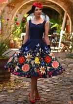 Dans de zomer in met deze Enchanted Garden swing jurk in marineblauw! De kleurrijke bloemenprint wordt speels aangevuld met vlinders aan de onderzijde voor een charmant, luchtig effect. Met een subtiele sweetheart halslijn, mouwloos en handige steekzakken is ze net zo praktisch als charmant. Gemaakt van een zachte stofmix met een hele lichte stretch, zodat je vrij kunt bewegen bij elke stap en draai. * Full swing * Subtiele sweetheart halslijn * Zijwaartse steekzakken * Blinde rits achterzijde * Combineer met een van onze petticoats voor een extra feestelijk effect * Valt bij een lengte van 1,70 m over de knie