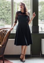 “Sweet, chic & just a little mysterious.” Maak kennis met Ella Lace, tijdloos, charmant en onweerstaanbaar vrouwelijk! Deze zwarte swingjurk, ontworpen door onze eigen in-house designers, heeft 3/4 mouwen van fijn kant en een charmant Peter Pan-kraagje dat zorgt voor die typische vintage flair. Uitgevoerd in een zachte, stretchy stofmix die prachtig met je meebeweegt: elegant, comfortabel en onweerstaanbaar stijlvol in één. * Swing model * Peter Pan kraagje * 3/4 kanten mouwen * Zijwaartse steekzakken * Blinde rits achterzijde * Valt bij een lengte van 1,70 m over de knie * Exclusief bij Topvintage verkrijgbaar