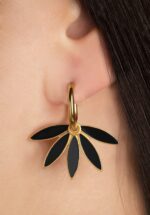 Gemma is Latijn voor ‘bladknop’ en de Italianen bedoelen er juweel of edelsteen mee. Het kon dus niet anders dan dat deze emaille oorbellen, met bladvorm in zwart, zo moesten heten. Uitgevoerd in (14K) verguld messing met een verguld RVS ringetje die eenvoudig open en dicht klikken. * Ringetjes met hanger * Verguld (14K) RVS en messing * Emaille * Verkleuren en vlekken niet * Nikkelvrij (anti-allergeen)