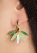 Gemma is Latijn voor ‘bladknop’ en de Italianen bedoelen er juweel of edelsteen mee. Het kon dus niet anders dan dat deze groene emaille oorbellen, met bladvorm, zo moesten heten. Uitgevoerd in (14K) verguld messing met een verguld RVS ringetje die eenvoudig open en dicht klikken. * Ringetjes met hanger * Verguld (14K) RVS en messing * Emaille * Verkleuren en vlekken niet * Nikkelvrij (anti-allergeen)