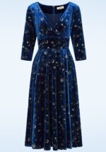 “Where sparkle meets sophistication!” Voel de magie van de nacht in de betoverende Moonlit Stardust swing jurk. Met een elegante V-halslijn, flatterende 3/4 mouwen en een zwierige rok die je silhouet prachtig laat uitkomen. Uitgevoerd in middernachtblauw met een glanzende, stretchy stof die aanvoelt als fluweel, en bezaaid met glinsterende goudkleurige sterren en maantjes voor een echte avondlook. * Swing jurk * V-hals met vaste overslag * Gevoerde top * 3/4 mouwen * Rits- en haaksluiting achterzijde * Reikt bij een lengte van 1,70 m over de knie