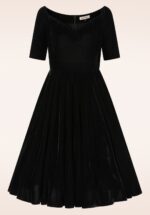 âOld Hollywood charm, modern-day confidence.â Laat je innerlijke filmdiva stralen in deze elegante swing jurk. De off-shoulder mouwtjes en subtiele sweetheart halslijn geven haar een verleidelijke, vrouwelijke uitstraling, terwijl het zwarte fluweel zorgt voor een vleugje old Hollywood glamour. De flatterende swingrok beweegt sierlijk mee bij elke stap en ze is uitgevoerd in een zachte, stretchy fluweelachtige stofmix die niet alleen prachtig oogt, maar ook heerlijk comfortabel draagt. Perfect voor een feestje, diner of een avond uit. * Swing jurk * Subtiele sweetheart halslijn met siliconen biesjes  * Korte mouwtjes met elastiek die off-shoulder gedragen kunnen worden * Rits- en haaksluiting achterzijde * Voorzien van zakken! * Reikt bij een lengte van 1,70 m over de knie