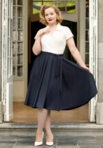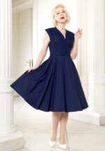 “Grace, glamour… and just a hint of danger… Ava would approve!” Deze classy swing beauty is ontworpen door onze eigen in-house ontwerpers en is een ode aan tijdloze elegantie, geïnspireerd door de iconische stijl van Ava Gardner en haar ongedwongen charme in de film ‘Barefoot Contessa’ uit 1954. Uitgevoerd in een navyblauwe, stevige, high quality stof met een lichte stretch die heerlijk draagt. “Classic navy, iconic attitude; fit for a Diva!” * Swing stijl * Mouwloos * V-hals met sierknoopjes * Gevoerde top * Afneembare riem voor een extra ‘snatched’ taille * Rok met platte plooien * Blinde rits aan de achterzijde * Exclusief bij Topvintage verkrijgbaar * Gorgeous Julia Fiore (Fiorevanil) is 1,70 m; haar accessoires zijn haar eigen vintage treasures