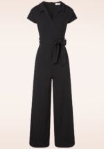 ”Feeling fierce in all black!” Cora is stijlvol en comfortabel tegelijk! Ze heeft een vaste, gevoerde overslag top, is aansluitend in de taille en heeft lange wijde pijpen die je benen eindeloos lang laten lijken. Uitgevoerd in een stevige en soepele crêpe achtige stofmix voorzien van een fijne stretch voor een uitermate comfortabel draagcomfort. Deze tijdloze beauty is makkelijk te combineren en onmisbaar in je retro garderobe! * Gevoerde overslag top * Ritssluiting achterzijde * Wijde pijp