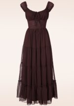”The world looks better in a pretty dress!” Ally heeft cottagecore vibes to the max en is voorzien van korte kapmouwtjes met elastiek die off-shoulder gedragen kunnen worden en het typische aansluitende lijfje met elastisch smock vanwaar ze uitloopt in een flowy midaxi rok. Uitgevoerd in een luchtige, doorschijnende, bordeauxbruine stof en is geheel gevoerd. * Midaxi jurk * Strikbandjes bij de hals * Korte kapmouwtjes met elastiek * Kan off-shoulder gedragen worden * Aansluitend lijfje voorzien van elastisch smock * Geen rits of knopen; aantrekken en ready to go! * Valt bij een lengte van 1,70 m tot net boven de enkel