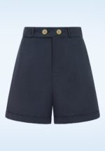 De zomer komt er aan, tijd om je beentjes te showen! Dit retro modelletje draag je hoger in de taille en heeft korte pijpjes afgewerkt met een speels omslagje die super flatterend staat bij zowel dames met slanke benen als dames met curvy benen 😉 Uitgevoerd in een stevige maar aangename, navyblauwe viscosemix (stretcht amper) dat perfect is voor het aankomende seizoen. ”Life’s too short, to not wear shorts!” * Hoog taille model * Knoop- en ritssluiting voorzijde * Riemlussen * Zijwaartse steekzakken * Ietwat wijdere pijpjes * Omslagjes