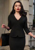 “Waist snatched. Confidence unmatched. This blazer means business with a twist.” Dit seizoen hebben onze getalenteerde in-house designers zich laten inspireren door draagbare en klassieke silhouetten met een White Collar Edge; items voor de power vrouw die de zakenwereld omver blaast met haar hyper vrouwelijke silhouet. Deze licht getailleerde blazer top met subtiel peplum detail is uitgevoerd in een stevige, maar soepele zwarte high quality stof, die niet kreukt en voorzien is van een lichte stretch, waardoor ze ongelofelijk comfortabel draagt! ”Old Hollywood hourglass, new-era ambition!” * Licht getailleerde blazer (ook als top te dragen) * Afgeronde kraag * 3/4 mouwen * Subtiele schoudervulling * Knoopsluiting voorzijde * Peplum detail * De matching fishtail rok is apart verkrijgbaar in onze shop!