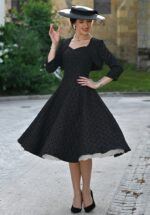 “Timeless romance, effortless style!” Breng een vleugje elegantie in je garderobe met deze zwarte swing jurk en bijpassende bolero. De subtiele sweetheart halslijn en het reliëfbloemenpatroon zorgen voor een vrouwelijke, charmante uitstraling, terwijl de zachte, licht stretchende stofmix zorgt voor optimaal comfort. Ideaal voor een feestje, diner of een verfijnde daglook – compleet met de bolero voor een stijlvolle finishing touch. * Swing jurk met bijpassende bolero * Subtiele sweetheart halslijn * Mouwloos * Voorzien van zakken! * Blinde ritssluiting aan de achterzijde * Te combineren met een petticoat voor een extra feestelijk effect * Valt bij een lengte van 1,70 m over de knie