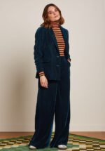 ”The world is already full of regular trousers” Peppa Garmine is uitgevoerd in een zachte en soepele, blauwe fluweel achtige stof (stretcht niet) met een verassend comfortabele pasvorm. * Flatterende hoge taille * Zijwaartse steekzakken * Rits- met haaksluiting voorzijde * Wijde, rechte pijpen * De afgebeelde blazer is niet verkrijgbaar in onze shop, wel hebben wij de bijpassende bomber jack
