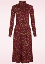 “Turn heads in turtlenecks!” Deze retro beauty heeft een col, lange mouwen en loopt vanaf de taille uit in een midi lengte semi-swing rok met vaste strikbanden in de taille. Ze is uitgevoerd in een soepele en stretchy EcoVero viscosemix met een grafische retro print in typische seventies kleuren. * Midi jurk met col * Vaste strikbanden in de taille * Reikt bij een lengte van 1,70 m tot op de kuit