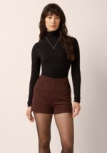 “Brown sugar, black magic, and just enough glitter to cause trouble.” Ze heeft een flatterende, hoge taille en een korte lengte zodat je benen gegarandeerd in de spotlights staan. Uitgevoerd in een iets dikkere stofmix met een lichte stretch met een grafische retro print in zwart en bruin, voorzien van een ingewerkte glitterdraad. * Hoge taille * Sierknoopjes voorzijde * ‘Faux’ steekzakjes * Blinde rits- en haaksluiting aan de achterkant * Korte, aansluitende pijpjes