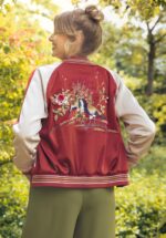 Twee voor de prijs van één! Ja, je leest het goed… deze reversible bomber draag je aan beide kanten! Eén kant is uitgevoerd in een prachtige dieprode, satijnachtige stof met crème gekleurde mouwen en een geborduurd patroon van pauwen en bloemen op de achterkant. De andere kant schittert in een blauwe satijnachtige stof met dieprode mouwen en contrasterende streepjes op de ribboorden. WOW! * Reversible * Stretchy ribboorden * Steekzakken aan beide kanten * Bronskleurige ritssluiting