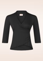 ”Repeat after me: I deserve Darla!” Ze is door onze eigen in-house designers ontworpen en exclusief bij Topvintage verkrijgbaar! Darling Darla is super veelzijdig en ontzettend flatterend door de vaste, geplooide overslag. Ze is uitgevoerd in een zachte en soepele zwarte viscosemix met een fijne stretch waardoor ze heerlijk draagt. ”Every woman needs a good basic!” * V-halslijn * Vaste overslag * Niet gevoerd * 3/4 mouwtjes * Lang genoeg om op een mid-waist broek of rok te dragen * Gorgeous Melisssa is 1,78 m * Exclusief bij Topvintage verkrijgbaar