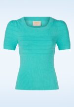 ”Timeless, comfy and cute!” Janett is door onze eigen in-house designers ontworpen en exclusief bij Topvintage verkrijgbaar! Ze heeft een vierkante halslijn, korte subtiele pofmouwtjes en is uitgevoerd in een heerlijk zachte en stretchy, fijngebreide, aquablauwe viscosemix met een ingewerkt patroon. Een veelzijdige top die niet mag ontbreken in de kast van een echte vintage loving lady! * Vierkante halslijn * Korte subtiele pofmouwtjes * Stretchy ribboorden * Lang genoeg om op een normale heupbroek te dragen * Exclusief bij Topvintage verkrijgbaar