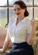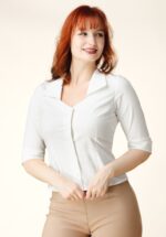 “A gentle nod to vintage, made for now.” Deze blouse van Topvintage Boutique is ontworpen door onze eigen in-house designers en exclusief bij Topvintage verkrijgbaar. Ze is uitgevoerd in een comfortabele katoenmix en afgewerkt met een puntige kraag, elegante V-halslijn en korte pofmouwtjes die zorgen voor een subtiele vintage touch. De licht getailleerde pasvorm volgt mooi je silhouet en maakt haar tot een veelzijdig item dat moeiteloos vrouwelijkheid en stijl uitstraalt. Een verfijnde blouse voor een tijdloze, elegante look. * Licht getailleerd * Puntige kraag * V-halslijn * Korte pofmouwtjes * Knopenreeks * Lang genoeg om op een normale heupbroek te dragen * Melissa is 1,78 m * Exclusief bij Topvintage verkrijgbaar
