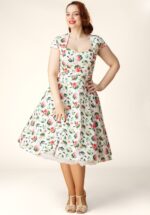 “Timeless beauty in bloom.” Deze prachtige Ella Floral Swing jurk is met liefde ontworpen door onze in-house designers en exclusief bij Topvintage verkrijgbaar. Ze is gemaakt van stevige, maar soepel vallende 100% katoen in fris wit en verrijkt met een romantische bloemenprint. * Full swing model * Sweetheart halslijn * Korte kapmouwen * Zijwaartse steekzakken * Blinde rits achterzijde * Combineer met een van onze petticoats voor een extra feestelijk effect * Valt bij een lengte van 1,70 m over de knie * Exclusief bij Topvintage verkrijgbaar!
