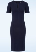 “Own your silhouette.” Mira heeft een hoge halslijn met verfijnd opengewerkt detail, korte mouwen en een nauwsluitende rok die je silhouet prachtig accentueert. De stevige maar soepele, stretchy crêpe-achtige stofmix in elegant marineblauw zorgt voor een comfortabele én flatterende fit. * Aansluitend model * Hoge halslijn met opengewerkt detail * Korte mouwen * Blinde rits achterzijde * Reikt bij een lengte van 1,70 m over de knie * Exclusief bij Topvintage verkrijgbaar