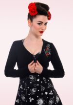 Zorg dat je retro outfit goed tot zijn recht komt met deze Bolero in zwart! Ook in de zomer kan het in de avond nog wat fris aanvoelen maar je hebt je mooiste zomerjurk aan en een jasje doet daar afbreuk aan, wat nu? Nou, deze stijlvolle bolero aanschaffen dus! Uitgevoerd in een warme, stretchy, fijngebreide stof en afgerond aan de voorzijde zodat hij mooi langs je buste valt. Afgewerkt met een bredere ribboord langs de mouwtjes voor een aansluitende pasvorm die mooi in vorm blijft. Laat je jas maar aan de kapstok want deze bolero is warm en elegant! * Afgeronde boord * Lange mouwen * Elastisch ribboord