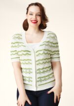 “Knit me up, buttercup!” Dit fijngebreide vestje is ontworpen door onze eigen in-house designers en is de perfecte mix van speels en stylish. Ze heeft korte mouwtjes, een vrouwelijke V-halslijn en een sierlijk opengewerkt ajourpatroon dat zorgt voor een luchtige, romantische look. De frisse groene strepen geven haar een vrolijke retro-vibe. Uitgevoerd in een zachte en stretchy viscosemix in wit, waardoor ze heerlijk comfortabel draagt. * V-halslijn * Korte mouwen * Knopenreeks * Opengewerkt ajourpatroon * Stretchy ribboorden * Lang genoeg om op een normale heupbroek te dragen * Exclusief bij Topvintage verkrijgbaar