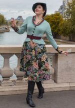 “Everyday elegance with a touch of vintage charm.” Deze prachtige swingjurk combineert een zacht, mintgroen lijfje van een stretchy viscosemix met een rijk geweven, zwaardere rok van een katoenmix voorzien van een kleurrijke bloemenprint. De afneembare riem accentueert je taille voor een vrouwelijk silhouet met een vleugje retro. De praktische steekzakken zijn subtiel in de rok verwerkt en de lange mouwen en contrastboorden geven haar een elegante, verfijnde uitstraling. * Swing model * Afgeronde kraag * Lange mouwen met contrasterende boorden * Functionele knopenreeks aan het lijfje * Verborgen knoopsluiting aan de voorzijde van de rok * Afneembare riem, voor een extra ‘snatched’ taille * Voorzien van zakken! * Valt bij een lengte van 1,70 m over de knie