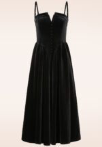 ”Looking fabulous and glamorous!” Deze prachtjurk heeft een subtiele V bij de halslijn, een reeks ‘faux’ knopen en verstelbare schouderbanden. Ze is uitgevoerd in een ietwat dikkere en zwaardere, maar soepele en stretchy, zwarte stof met de look and feel van luxe fluweel, die heerlijk draagt. * Midi jurk * Verstelbare schouderbanden * Reeks ‘faux’ knopen * Blinde rits met haaksluiting achterzijde * Valt bij een lengte van 1,70 m tot over de kuit