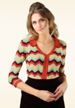 Feel the sixties vibe met deze Zoe Zig Zag Collar Top in Earth and Aqua! Eenvoudig maar toch speciaal door het geweldige zigzagpatroon! De top heeft een mooie v-hals met speels kraagje en 3/4 mouwtjes, só cute! Uitgevoerd in een heerlijke soepele en stretchy viscosemix met een zigzagpatroon in oranjebruin, geel en blauwtinten die zijn perfecte pasvorm zal blijven behouden, zelfs na een aantal wasbeurten. Een veelzijdige top die niet mag ontbreken in de kast van een echte retro loving lady 😉 * V-hals * Kraagje * 3/4 mouwtjes * Lang genoeg om op een normale heupbroek te dragen