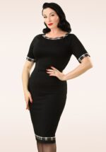Deze Work It Out Check Trim Pencil Dress in Black is sexy EN super sophisticated! Dit nauw aansluitende prachtexemplaar heeft een elegante boothals, korte mouwen en contrasterende geruite biezen. Uitgevoerd in een stevige maar soepele, zwarte stof met een lichte stretch die je rondingen prachtig benadrukt. Omarm het verleden en herleef de fabulous fifties in deze beauty! * Aansluitend model * Boothals * Korte mouwen * Blinde rits zijkant * Split achterzijde * Ava is 1,69 m
