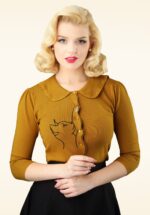 ‘Behind every great person, there is a great cat… cardigan!’ Deze cutie heeft een speels peter pan kraagje, 3/4 pofmouwen, een reeks glanzende knopen en een prachtig kattenborduursel. Uitgevoerd in een zachte en stretchy viscosemix in mosterdgeel. ‘Oh kitty cat, stop being so cute!’ * Peter pan kraagje * 3/4 pofmouwen * Reeks glanzende knopen * Elastisch ribboord aan de mouwen en zoom * Lang genoeg om op een normale heupbroek te dragen