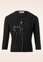 ‘Behind every great person, there is a great cat… cardigan!’ Deze cutie heeft een speels peter pan kraagje, 3/4 pofmouwen, een reeks glanzende knopen en een prachtig kattenborduursel. Uitgevoerd in een zachte en stretchy viscosemix in zwart. ‘Oh kitty cat, stop being so cute!’ * Peter pan kraagje * 3/4 pofmouwen * Reeks glanzende knopen * Elastisch ribboord aan de mouwen en zoom * Lang genoeg om op een normale heupbroek te dragen