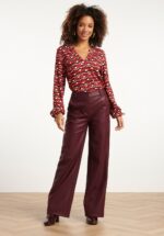 ”Baby i am a rockstar!” Feline wordt hoog in de taille gedragen en is uitgevoerd in een stevige maar toch soepele imitatie lederen stof in bordeauxrood (stretcht amper) die heerlijk draagt. ”Rock on, baby!” * ‘Faux’ leder * High waist * Steekzakken voorzijde * ‘Faux’ paspelzakjes achterzijde * Lusjes voor je riem * Rits- en knoopsluiting voorzijde * Lange wijde pijpen