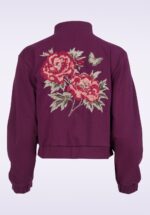 ”Bold blooms, vintage vibes!” Dit donkerpaarse/bordeaux jasje is een echte blikvanger. De voorkant oogt clean en tijdloos met stoere drukknopen, maar de achterkant verrast met een prachtige geborduurde bloemenpatch die een speelse, vrouwelijke touch geeft. Uitgevoerd in een stevige maar soepel vallende, stretchy mix van organisch katoen en gerecyclede materialen – duurzaam, comfortabel én perfect om elke outfit een retro flair te geven. * Jack * Opstaand kraagje * Lange mouwen * Drukknopen * Voorzien van zakken * Bloemen borduursel achterzijde * Lang genoeg om op een normale heupbroek te dragen