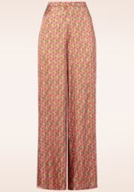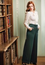 Geïnspireerd op de pantalons die de vooruitstrevende dames in de jaren 40-50 droegen! De vrouwelijke hoge taille vormt een mooi contrast met de wijde pijp en heeft een super afkledend effect, ook als je vollere heupen/billen hebt. Het strikje en knoopdetail aan de achterzijde maken het geheel helemaal af. Uitgevoerd in een soepel vallend, licht stretchy stofje in teal/groen en afgewerkt met een chique omslagje bij de pijpen. Combineer met een witte blouse en pumps voor de perfecte zakelijke look in retro stijl! * Wijde pijpen * Afneembaar strikje voorzijde * Zijwaartse steekzakjes * Blinde rits zijkant * Gemakkelijk in te korten * Vanessa Frankenstein is 1,67 m * De afgebeelde blouse is niet meer verkrijgbaar in onze shop * De afgebeelde pumps zijn niet verkrijgbaar in onze shop