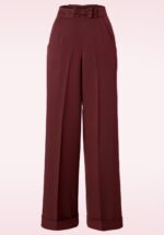 De 40s Hidden Away Trousers is geïnspireerd op de pantalons die de vooruitstrevende dames in de jaren 40-50 droegen! De vrouwelijke hoge taille vormt een mooi contrast met de wijde pijp en heeft een super afkledend effect, ook als je vollere heupen/billen hebt. Het bordeauxrode strikje en knoopdetail aan de achterzijde maken het geheel helemaal af. Uitgevoerd in een soepel vallende bordeauxrode katoenmix met een lichte stretch en afgewerkt met een chique omslagje bij de pijpen. Combineer met een blouse en pumps voor de perfecte zakelijke look in retro stijl! * Wijde pijpen * Afneembaar strikje voorzijde * Zijwaartse steekzakjes * Blinde rits zijkant * Gemakkelijk in te korten * Onze stunning redhead Vanessa Frankenstein is 1,67 m