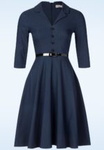 ”Effortlessly chic, effortlessly me!” Deze classy semi swing beauty heeft een elegante v-halslijn met revers kraag, decoratieve knoopjes aan de voorzijde en is voorzien van handige steekzakken. Ze is uitgevoerd in een stevige maar stretchy bengaline achtige marineblauwe stof voorzien van een witte krijtstreep, die heerlijk comfortabel draagt. * Swing model * V-halslijn met revers kraagje * Sierknopen aan de voorzijde * 3/4 mouwen * Afneembaar lakriempje, voor een extra ‘snatched’ taille * Voorzien van zakken! * Blinde rits achterzijde * Valt bij een lengte van 1,70 m net over de knie * Exclusief bij Topvintage verkrijgbaar