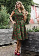 “Stop and smell the roses… in style!” Voel je vrouwelijk en zelfverzekerd in Athena! Ze heeft een vaste overslagtop met vaste strik, lange pofmouwen voor extra drama en elegantie, en loopt vanaf de taille subtiel uit in een zwierige semi-swing rok. Uitgevoerd in een soepel, licht glanzend slinky stofje in zwart met een prachtige print van rode rozen, dat bij elke stap prachtig meebeweegt. Perfect voor een chique avondje uit of een stijlvolle dag look met een retro touch. * Semi-swing stijl * V-hals met overslag * Gevoerde top * Lange pofmouwen met manchetten * Vast strikdetail in de taille * Geen rits of knopen; aantrekken en ready to go! * Exclusief bij Topvintage verkrijgbaar * Valt bij een lengte van 1,70 m ruim over de knie
