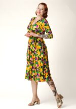 “Twirl now, worry never.” Deze kleurrijke beauty heeft een vaste overslag top met een elegant geplooide tailleband en een vaste strik, vanwaar ze uitloopt in een zwierige semi-swing rok. Aria is uitgevoerd in een soepele en stretchy slinky stof met een subtiele glans die licht van gewicht is, prachtig meebeweegt én niet kreukt — perfect voor zorgeloos draagplezier. * Semi-swing model * V-halslijn * Vaste overslag * 3/4 mouwen * Geplooide tailleband met vaste strik * Geen rits of knopen; aantrekken en ready to go! * Valt bij een lengte van 1,70 m over de knie * Exclusief bij Topvintage verkrijgbaar
