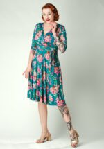 “Easily distracted by… beautiful dresses!” Aria betovert met een sierlijke all-over bloemenprint met schattige vogeltjes. Ze is uitgevoerd in een soepele en stretchy slinky stof in een prachtige teal tint met een subtiele glans. Licht van gewicht, kreukvrij én heerlijk comfortabel om te dragen. * Semi-swing model * V-halslijn * Vaste overslag * 3/4 mouwen * Geplooide tailleband met vaste strik * Geen rits of knopen; aantrekken en ready to go! * Valt over de knie bij een lengte van 1,70 m * Exclusief bij Topvintage verkrijgbaar