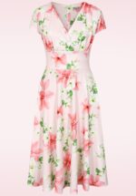 “Blushing in light pink, kissed with gentle lilies.” Esmeralda is uitgevoerd in een iets dikkere maar soepele en stretchy, crêpe achtige stof in heel lichtroze die heerlijk draagt, niet kreukt en voorzien is van een lelie print. * Swing model * Vaste, geplooide en gevoerde overslag top * Blinde rits achterzijde * Valt bij een lengte van 1.70 m over de knie * Exclusief bij Topvintage verkrijgbaar
