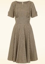 “Classic checks, endless charm!” Deze prachtige swing jurk straalt klassieke charme uit met haar geruite print in warme beige- en bruintinten. De flatterende brede tailleband accentueert je silhouet op elegante wijze, terwijl de zwierige rok en handige zakken zorgen voor een speelse, vrouwelijke look. Uitgevoerd in een stevige maar soepele stofmix met een optimaal draagcomfort. * Swing model * Korte mouwtjes met decoratieve knoopjes * Brede tailleband * Zijwaartse steekzakken * Rits- en haaksluiting achterzijde * Valt bij een lengte van 1,70 m over de knie