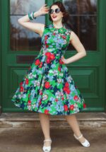 “A little bloom in every step.” Deze Botanical Beauty swingjurk heeft een groene basis met een bloemenprint in rood, crème en blauwtinten. De afgeronde kraag en decoratieve knopen zorgen voor een speels detail, waarvan twee functioneel zijn. De jurk is voorzien van zakken en sluit met een blinde ritssluiting aan de zijkant voor een nette pasvorm. Uitgevoerd in een stevige maar comfortabele katoenmix en perfect te combineren met een petticoat voor extra volume en zwier. * Swing jurk * Afgeronde kraag * Decoratieve knopen (waarvan 2 functioneel) * Voorzien van zakken! * Blinde ritssluiting aan de zijkant * Te combineren met een petticoat voor een extra feestelijk effect * Valt bij een lengte van 1,70 m over de knie