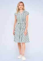 ”Steer yourself in the right direction!” Deze luchtige swing beauty heeft een elegante V-halslijn, reverskraagje, korte mouwen en loopt uit in een prachtige swing rok, die jou een prachtig vrouwelijk silhouet geeft! Uitgevoerd in een soepele en luchtige, crème kleurige 100% katoen voorzien van een groene streepjes en ankertjes. * Swing model * V-halslijn * Reverskraagje * Korte mouwen met vaste omslagjes * Reeks knopen * Afneembare riem, voor een extra ‘snatched’ taille * Zijwaartse steekzakken * Valt bij een lengte van 1,70 m tot halverwege de kuit