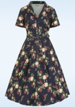 “Bloom with timeless charm!” Deze donkerblauwe swing jurk is een echte vintage beauty. Ze heeft een elegante reverskraag, korte mouwen en een flatterend swing model dat je taille mooi accentueert. Uitgevoerd in een stevige maar ademende en soepel vallende katoenmix en voorzien van een speelse bloemenprint. * Swing model * V-halslijn * Reverskraagje * Korte mouwtjes met omslagjes * Reeks knopen * Afneembare riem * Zijwaartse steekzakken * Valt bij een lengte van 1,70 m tot halverwege de kuit