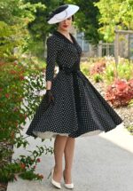 “Spot on with timeless style!” Deze zwarte swing jurk met witte polkadots is pure retro-chic! Ze heeft een vaste overslag met een elegante V-hals en reverskraag, flatterende 3/4 mouwen en een afneembaar striklint in de taille dat je silhouet prachtig benadrukt. Gemaakt van een soepele en comfortabele katoenmix met een lichte stretch, waardoor ze heerlijk draagt en je look een speelse fifties flair krijgt. * Swing jurk * Revers kraag * Vaste overslag * 3/4 pofmouwen * Voorzien van zakken! * Afneembaar striklint, voor een extra ‘snatched’ taille * Blinde ritssluiting aan de zijkant * Te combineren met een petticoat voor een extra feestelijk effect * Valt bij een lengte van 1,70 m over de knie * Let op; de kleur van het product op de video kan afwijken van de daadwerkelijke kleur van het product * De pumps en accessoires die in de video worden getoond zijn niet verkrijgbaar in onze shop
