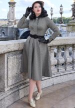 “Elegance is all in the details!” Manel Abalone is afkomstig uit de nieuwe collectie en geïnspireerd op de extraordinaire Marie-Louise Carven — een baanbrekende Franse couturière uit de jaren ’40 en ’50! Deze swing beauty straalt tijdloze charme uit met haar lange mouwen, klassieke Peter Pan-kraag en vaste stropdasdetail. De getailleerde snit zorgt voor een prachtig vrouwelijk silhouet, terwijl de soepelvallende stof haar een elegante, vintage uitstraling geeft. Ze sluit met een rits aan de achterzijde en knoopjes aan de voorzijde. * Swing model * Peter Pan kraagje * Vast stropdasdetail * Lange mouwen met manchetten * Flatterende plooitjes bij de buste * Functionele knopenreeks aan de voorzijde * Blinde rits aan de achterzijde * Afneembare riem, voor een extra ‘snatched’ taille * Voorzien van zakken! * Valt bij een lengte van 1,70 m over de knie