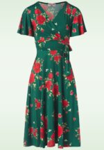 Hoe mooi is deze Irene Flower Cross Over Swing Dress in Silky Green?! Ze laat je op en top vrouw voelen door de prachtige aansluitende overslag top met een sexy V-halslijn, speelse strikbandjes die je zowel los als gestrikt kunt dragen en haar flatterende plooien in de taille. De zwierige vlindermouwtjes geven haar een flirty touch terwijl de flatterende semi-swing rok zorgt voor een flinke portie elegantie, wow! Ze is uitgevoerd in een glad en soepel, licht glanzend, donkergroen, stretchy stofje bezaaid met prachtige rode rozen, dat garant staat voor veel kreukvrij draagplezier. Irene is liefde, pure jurken-liefde! * Semi-swing model * V-halslijn * Vaste overslag * Korte vlindermouwen * Vaste strikbandjes * Geen rits of knopen * Onze gorgeous blondine Melissa is 1.78 m