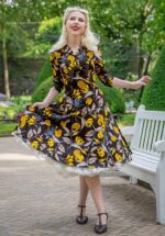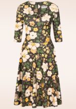 “Wearing this floral dress is like being hugged by a garden, minus the thorns!” 😉 Uitgevoerd in een stevige maar toch soepele zwarte katoenmix met een fijne stretch voorzien van een prachtige bloemenprint die heerlijk draagt. * Vierkante halslijn * 3/4 mouwen * It has pockets! * Blinde ritssluiting achterzijde * Te combineren met een petticoat voor een extra feestelijk effect * Valt bij een lengte van 1,70 m over de knie