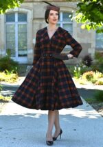 “Chic in checks!” Deze swing jurk brengt pure fifties charme tot leven! Ze heeft een klassieke reverskraag, 3/4 mouwen en een flatterende taille die overloopt in een zwierige swing rok. Uitgevoerd in een stevige maar soepel vallende stofmix met een vleugje viscose, voorzien van een tartan ruitje in roestbruin en navyblauw. Of je haar nu draagt met hakken of ballerina’s, deze beauty laat jouw retro hart sneller kloppen! * Swing jurk * Revers kraag * Functionele knopen voorzijde * 3/4 mouwen * Voorzien van zakken! * Afneembare riem, voor een extra ‘snatched’ taille * Te combineren met een petticoat voor een extra feestelijk effect * Valt bij een lengte van 1,70 m over de knie